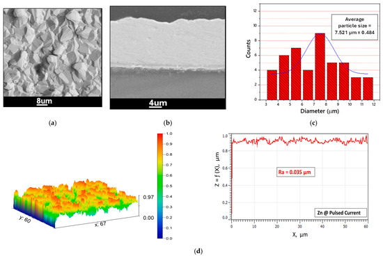 (a) SEM micrograph, (b) SEM cross-sectional micrograph, (c) particle size distribution histogram, and (d) surface topography micrograph and roughness profile of Zn layer electrodeposited at a pulsed current density of −5 mA/cm2 (2 s on-time–1 s off-time) and 60 °C for 1 h.