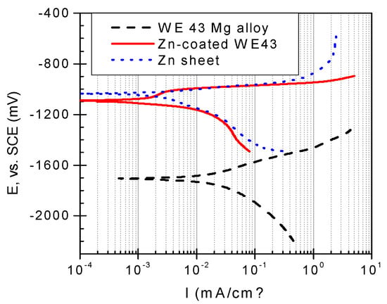 Potentiodynamic polarization diagrams of WE43-T6 Mg alloy substrate, Zn-coated WE43-T6 Mg alloy, and Zn sheet in 0.1 M NaCl solution.