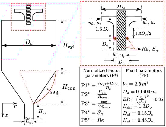 The factor parameters are presented in Figure 1. From to , they represent a non-dimensional form of the main geometrical parameters of the construction of the spray dryer. is the height-to-width ratio of the chamber and is frequently mentioned in the literature. For short-form chambers (low values), this parameter affects the transient flow behavior [16] as stronger flow instabilities are likely to develop [10]. is the height ratio of the cylindrical and conical sections of the drying chamber. According to Huang et al. [12], this relation has a strong effect on the positioning of the recirculation zone, which in turn affects flow stability and particle transport. defines if the chamber has a straight or parabolic bottom section. The effects of this factor are discussed in Keshani et al. [13], where its important effects on flow uniformity and particle deposition on the walls are highlighted. is the swirl number measured at the jet discharge, which depends on the geometrical design of the air disperser and its guide vanes. is calculated as