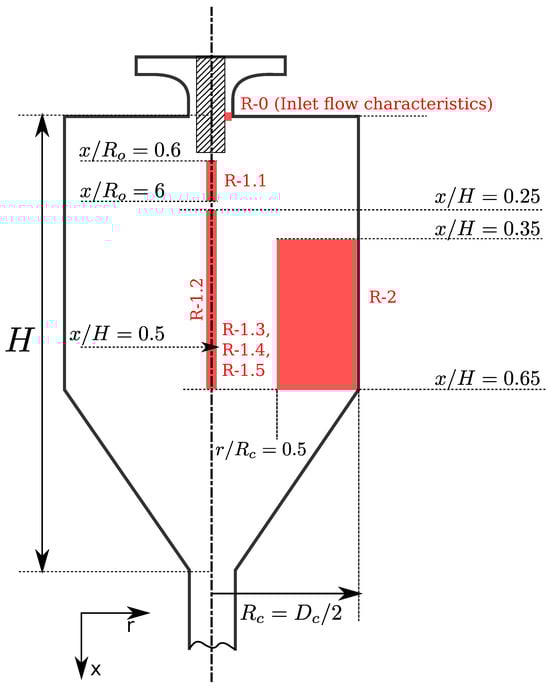 Due to the nature of the computational simulation, which allows for measuring the responses at any point within the domain, the internal flow dynamics is represented in this study as a series of quantitative response variables. These variables are defined for two primary zones within the drying chamber previously identified by Hammad et al. [39], represented by the central jet (R-1) and the main recirculation zone (R-2). Within these zones, eight key response variables are determined—five in zone R-1 (R-1.1 to R-1.5) and three in zone R-2 (R-2.1 to R-2.3). The positioning of these zones in a simplified drying chamber is presented in Figure 2, while a detailed description, including response modes, is shown in Table 3.