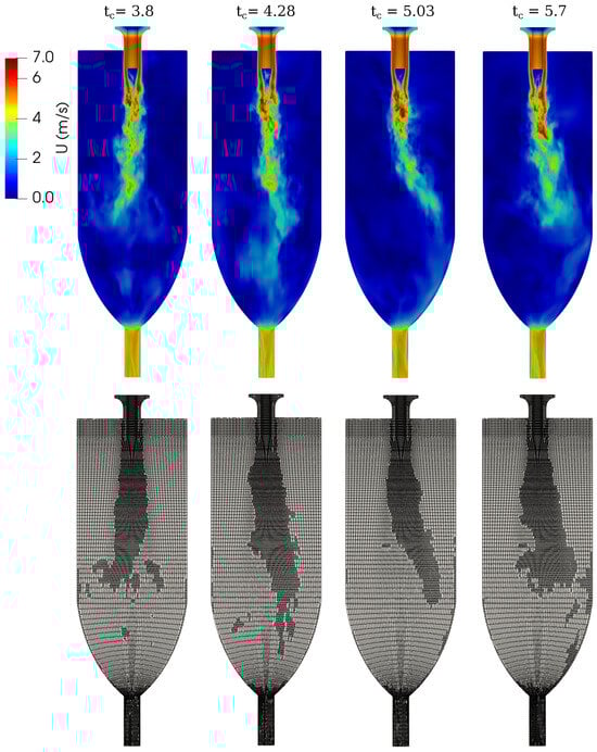 Figure 4 presents the velocity field and computational grid for Experiment 8 at different simulation times. The resolution of turbulence (detached eddies) downstream of the discharge and the deflection of the jet towards the sides of the drying chamber were observed. This behavior was captured dynamically using the AMR method. Grid refinements in near-wall elements were observed during instances of pronounced jet deflection. (). Upstream of the discharge, constant refinement was present at all times. This acceptable dynamic refinement behavior was observed in all the simulations.