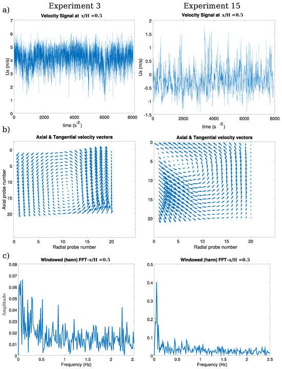 For the same normalized axial position used to read R-1.3 ( in the axis), three additional response variables are measured, as follows: the rms fluctuations of the axial velocity (R-1.4) and the dominant frequency characteristics (R-1.5). The rms fluctuations of the axial velocity () indicate the amount of turbulence in the central jet and can be related to its decay and stability. The dominant frequency response parameter R-1.5 is calculated using a Fourier Fast Transform (FFT ). This analysis aims to process velocity-time signal data into a frequency spectrum, as discussed by Woo et al. [16]. The frequency spectrum data are used to determine the existence or absence of precession in the main jet. According to Southwell and Langrish [40], the oscillations arising from such precessions within a large expansion should be avoided in spray dryers because they tend to cause undesirable back-mixing and particle deposition on walls, ruining the quality of the products. The results of this analysis will determine how the precession in the central flow is affected by geometric factors of the chamber, regardless of the amount of swirl at the jet discharge.