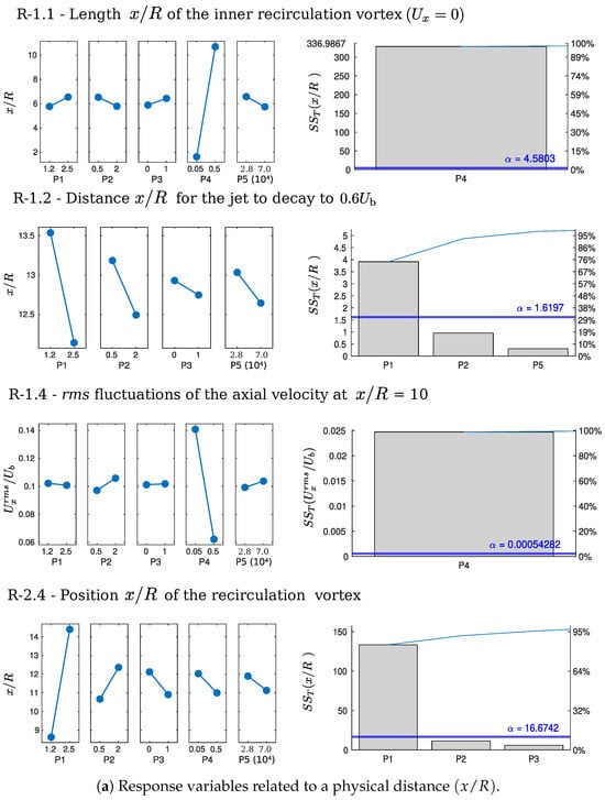 The responses for the physical and normalized distances are presented in Figure 6a,b. For this response, the results of the effect of P4* were not included. This is because the effect of the swirl was so strong that when P4* = 0.5, the jet decayed very quickly, and values of were not detected by any of the probes measuring this response. Additionally, the swirl prevented the reattachment of the jet; therefore, in the near region, the measured velocity values were close to zero, or even negative, due to the lengthening of the internal recirculation zone (see R-1.1). For these reasons, the effect of P4* was conveniently represented in response R-1.3.