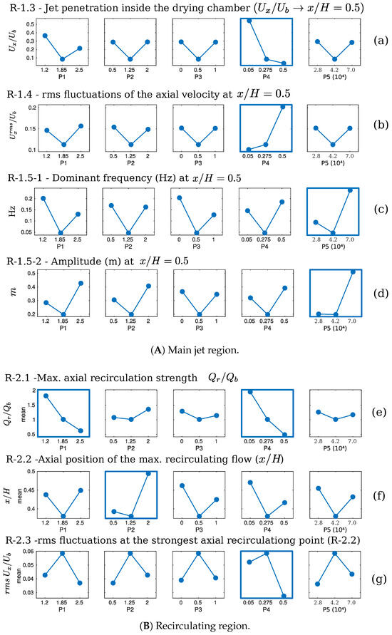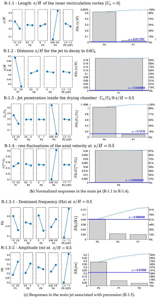 Regarding responses associated with the effect of P5* on the precessing motion of the jet (R-1.5), a concave upwards response was observed for both the dominant frequency (R-1.5.1) and amplitude (R-1.5.2). The concavity was much more evident for the dominant frequency (see Figure 7c). This is because P5* was barely over the significance threshold (p-value = 0.05 in Figure 6c), so its center point response could be affected by other parameters with weak responses, such as P3* and P1*. These parameters generated a response in the reverse direction to P5*; therefore, additional experiments may be required to be confident of the curvature in this response. For the amplitude of the dominant frequency (R-1.5.2), presented in Figure 7d, there was more certainty in interpreting the result since P5* was more statistically significant in this case. Moreover, the weak factors (P1* and P2*) presented the same response direction in this case. Still, in the first interval (P5* = 2.8 to P5* = 4.2), there was no change in the response, only becoming significant after the midpoint, with an increase close to 150% at P5* = 7.0. In real-life applications, increasing the volumetric flow of drying air above a certain threshold is not convenient. Under the current configuration, this threshold represented a fill time lower than 11.64 s and a bulk velocity higher than 8.05 m/s at the discharge. These threshold values may be different when modifying the geometrical parameters of the annular jet and varying the chamber size, with this being an interesting issue to be addressed in future studies.