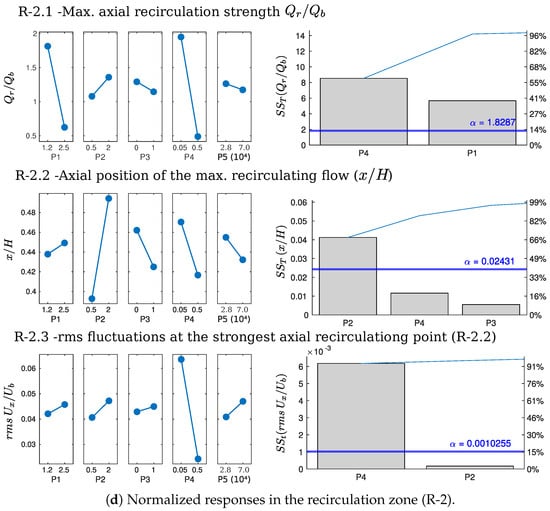 Table 6 presents a summary of the effects of the design parameters on the normalized responses. For the center jet region (R-1.1 to R-1.4), parameters P1* and P4* were the only ones with statistically significant responses. For the response variables measuring the jet precessing behavior (R-1.5), parameter P5* was the only one with a significant response, which was observed for both the precession frequency (R-1.5.1*) and the amplitude (R-1.5.2*). For the recirculation zone (R-2), it was observed that the recirculation flow (R-2.1*) was directly affected by P1* and P4*, while the position of the recirculation flow depended mostly on P2*. Finally, the rms fluctuations of the recirculation zone (R-2.3*) were directly affected by P4*, whereas the response of the other parameters was not statistically significant.