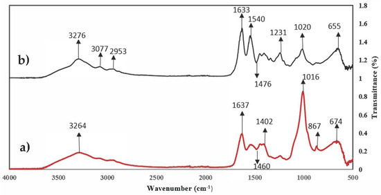 The FS chemical modification was studied with FTIR spectroscopy aiming to demonstrate that the modification of the FSs had been carried out. For this analysis, the technique of Leal-Castañeda et al. [33] was followed. The equipment used was an FTIR module IR2 equipped with an Indium Gallium Arsenide (InGaAs) detector, coupled to a Jobin-Yvon LabRam HR800 spectrometer (Horiba, Kioto, Japan). The starch samples were placed in a holder and analyzed over a wave number range of between 4000 and 450 m−1 with a spectral resolution of 4 cm−1, performing 36 scans per measurement, using an ATR contact objective.