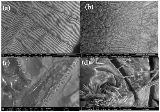 Scanning electron microscopy micrographs of (a) NFSs and (b) MFSs at 100×, scale bar 500 μm, and (c) NFSs and (d) MFSs at 2500×, scale bar 20 μm.