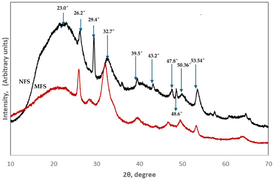 The X-ray diffraction pattern of the NFSs and MFSs is shown in Figure 3. The broad peaks corresponding to the apatite structure revealed that the flakes show relatively low levels of crystallinity due to the fact that the hydroxyapatite (HA) crystals could be as small as the HA crystals present in other mineralized collagen structures that are between 1.5 and 4 nm thick [45,46]. The peaks are found at 2θ = 26.2°, 29.4°, 32.7°, 39.5°, 43.2°, 47.8°, 48.6°, 50.36°, and 53.54°. These signals are seen in both diffractograms; however, in the MFS sample, some signals decreased in intensity, such as those located at 2θ = 29.4° and 53.54°; even the signal attributed to collagen in previous studies [47] at 2θ= 23°, observed as a wide band in both diffractograms, is diminished in the MFS sample due to the acid treatment. On the other hand, the signals observed at 2θ = 24.9° and 32.18° in the MFS sample could be attributed to the crystals observed in Figure 2d of the SEM analysis as a result of the applied acid treatment. However, the results obtained are comparable with previous data for fish scales [48] and other biological structures containing apatite [46,47,49].