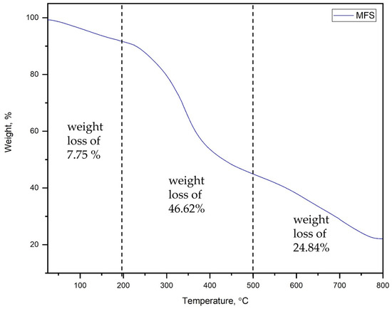 Figure 4 shows the thermal degradation behavior of the modified fish scales. It is shown that three weight-loss stages were found. The first stage starts at room temperature and reaches 200 °C with a weight loss of 7.75%, which could be attributed to the evaporation of water from the powder of the modified fish scales. The weight loss of the second stage was found to be 46.62% within a temperature range of 200–500 °C. This could be attributed to the decomposition of organic materials, such as proteins. In addition, an extension of the third stage from 500 °C to 800 °C was observed with a weight loss of 22.84%. This could be attributed to the formation of the deoxygenated hydroxyapatite via the dihydroxylation process and the conversion of calcium carbonate to calcium oxide. The obtained results agree with the literature on native fish scales in temperatures of up to 200 °C. However, higher weight loss (46.62%) was observed at temperatures ranging from 200 °C to 500 °C compared to the native fish scales (30%) [31]. Thus, the modified fish scales were stable up to 200 °C in this work, and they could be used in the removal of Pb(II) and Cd(II) from aqueous solutions.
