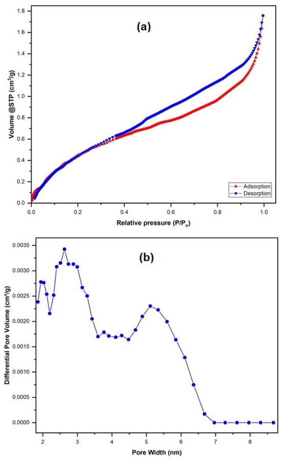 Nitrogen sorption analysis (Figure 5a) gave a total pore volume of adsorption of 0.0026 cm3/g, Langmuir surface area of 4.40 m2/g, and BET surface area of 1.91 m2/g, which is quite similar to the native fish scales’ BET surface area of 2.80 m2/g and pore volume of 0.0020 [31]. The non-local density functional theory gave an average pore size of 2.62 nm (Figure 5b) as a well-defined mesopore structure that could be a good framework for the future fabrication of nanocomposites.