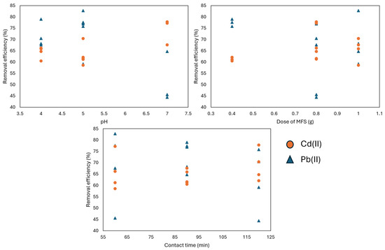 Removal efficiency of Pb(II) and Cd(II) with variations in pH, MFS dose, and contact time.