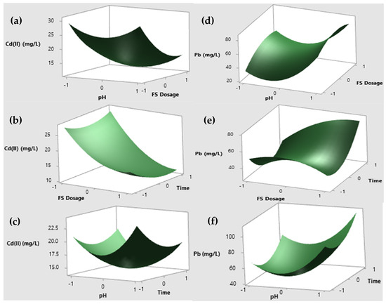 Three-dimensional graph of the response surface of (a) Cd(II) (mg/L) vs. dose of scales and pH; (b) Cd(II) (mg/L) vs. dose of scales and time; (c) Cd(II) (mg/L) vs. pH and time; (d) Pb(II) (mg/L) vs. dose of scales and pH; (e) Pb(II) (mg/L) vs. dose of scales and time; and (f) Pb(II) (mg/L) vs. pH and time.