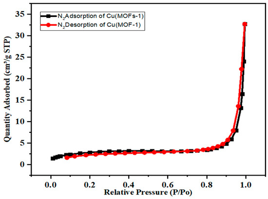 Cu-MOF-1 exhibited a type-IV N2 sorption isotherm with mesopores, showing a maximum nitrogen uptake indicating a pore size of 17.7059 nm, BET surface area of 9.9267 m2/g, Langmuir surface area of 8.6233 m2/g, and a pore volume of 0.0490593 cm3/g (equivalent to 31.71 cm3/g) (Figure 1).