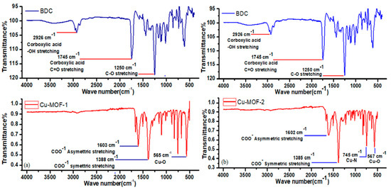 The FTIR spectra of benzene-1,4-dicarboxylic acid (BDC) are depicted by the blue-colored spectra in (a,b). Specifically, (a) corresponds to the FTIR spectra of Cu-MOF-1, while (b) corresponds to the FTIR spectra of Cu-MOF-2.