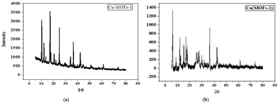 The crystallinity and phase purity of Cu-MOF-1 and Cu-MOF-2 were analyzed using PXRD (Figure 5). Cu-MOF-1 showed prominent peaks at 2-theta values ranging from 10.24° to 73.62°, indicating a crystalline structure. Cu-MOF-2 exhibited distinct sharp peaks with major diffraction patterns occurring between 6.0° and 73°. The average crystallite sizes were 62 nm for Cu-MOF-1 and 39 nm for Cu-MOF-2 with smaller crystallite sizes corresponding to increased peak broadening.