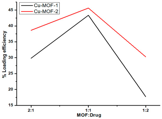 Both Cu-MOF-1 and Cu-MOF-2 were synthesized utilizing N,N-dimethylformamide (DMF), which is a solvent with a high boiling point. Following synthesis and drying, DMF may become incorporated into the MOFs, resulting in reduced porosity, adsorption capacity, and drug-loading capability. To eliminate incorporated DMF molecules, the MOFs underwent activation through a solvent-exchange technique. The MOFs were stirred with ethanol for 24 h, which was followed by separation, drying, and subsequent stirring with trichloromethane for another 24 h. In this procedure, DMF migrates from regions of higher concentration to lower concentration, facilitating its removal from the MOFs. Both ethanol and trichloromethane are solvents with low boiling points, allowing for easy evaporation. Subsequently, drug loading was carried out on the MOFs.