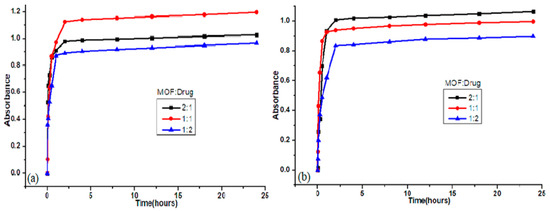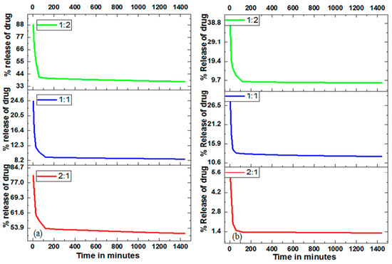 Drug liberation from (a) Cu-MOF-1 and (b) Cu-MOF-2 respectively across various ratios.