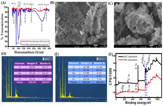 Characterization of magnetic nanocomposite (MNC) adsorbent before and after AR dye removal: (A) Fourier Transform Infrared Spectroscopy (FT-IR) spectra; (B,C) Field emission-scanning electron microscopy (FE-SEM) pictures; (D,E) Energy-dispersive X-ray spectroscopy (EDS) images; (F) X-ray photoelectron spectroscopy (XPS) profile.