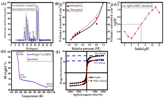 Instrumental analysis of MNC adsorbent: (A) X-ray diffraction (XRD) pattern; (B) Brunauer–Emmett–Teller (BET) surface area analysis; (C) Iso-electric charge (pHzpc) graph; (D) Thermogravimetric analysis (TGA) pattern; (E) Vibrating sample magnetometer (VSM) magnetic hysteresis profile.