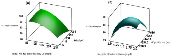 The optimal response level for each parameter was determined using response surface and contour plots to analyze the interactions between variables. A three-dimensional response surface plot was employed to identify each variable’s optimal response level and understand the linear effects of factor interactions [58]. The response surface curves for AR adsorption are displayed in Figure 3A,B.