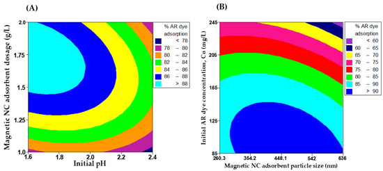 Contour plots for the interaction between (A) MNC adsorbent dosage and initial pH and (B) initial adsorbate concentration and adsorbent particle size on the removal of AR dye.