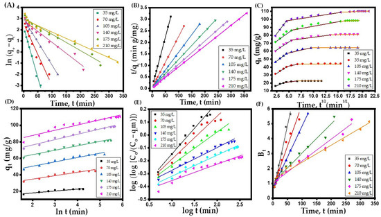 Figure 5. Various kinetic plots for removing AR dye from the aqueous phase using MNC adsorbent. (A) Lagergren pseudo-first-order (PFO) model; (B) Ho’s pseudo-second-order (PSO) plot; (C) Intra-particle diffusion (ID) model; (D) Elovich kinetic plot; (E) Bangham plot; and (F) Boyd plot. (Initial pH: 2; initial AR dye pollutant concentration: 35–210 mg/L; dose of MNC adsorbent: 1.5 g/L; MNC particle diameter: 448.1 nm; stirring speed: 150 rpm; time limit: 24 h; operating temperature: 301 K).