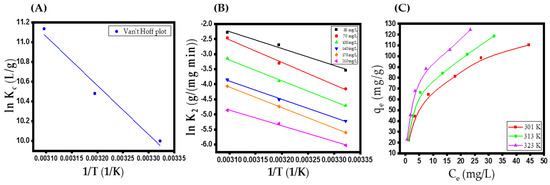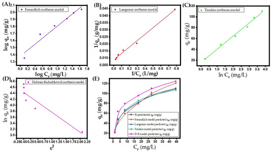 where KF, KL, KT, and KDR are the Freundlich, Langmuir, Temkin, and D-R model isotherm constants expressed in (L/g), (L/mg), (L/g), and (mole2/kJ2), respectively. The adsorption intensity is 1/n, Qmax is the utmost adhesion capacity of the nanomaterial (mg/g), BT refers to the heat of accumulating adsorbate, and qs for D-R isotherm theoretical equilibrium capacity (mg/g). The value of ε can be determined using the following Equation (16)