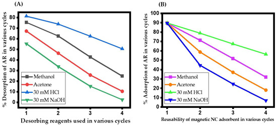 The ability to recycle adsorbent materials is crucial for making the adsorption process cost-effective and environmentally friendly. In terms of use, an advanced and superior adsorbent should possess features like removal efficiency, stability, and reproducibility. When adsorbent materials can be easily regenerated and reused, it reduces disposal issues and enhances environmental purity. The removal effectiveness increases with increasing acidity of the solution, and the adsorption is extremely pH-dependent. As a result, the solution’s pH can be lowered to initiate the desorption of AR. This implies that using an acidic solution to wash the loaded MNC adsorbent might aid in their renewal [31]. Desorption investigations were carried out separately for Alizarin red dye solution (100 mL) in a 165 mg/L concentration. The MNC adsorbent loaded with dye molecules was rinsed with 100 mL of various solvents such as methanol, acetone, 30 mM HCl, and 30 mM NaOH [32]. After adding the desorbing reagent, the solution was stirred at 150 rpm with a contact time of 12 h. The concentration of each eluent was measured using the obtained standard curve from the spectrophotometry method. After three water washes, the regenerated MNC adsorbent was magnetically isolated from the water and dried at 353 K until a consistent weight was reached. Following desorption, the regenerated MNC was used in the adsorption studies conducted by the adsorption experiments previously indicated in Section 2.4. This adsorption/desorption cycle was carried out four times. Every experiment was performed twice to ensure repeatable findings, and the Section 3 report the average values of these repetitions.