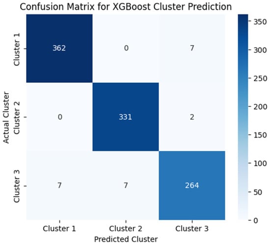The confusion matrix obtained from the XGBoost model implies a high degree of accuracy in predicting the assigned clusters. Most of the samples were correctly classified into their respective clusters, with minimal misclassification errors. Clusters 1 and 2 show almost perfect classification, 0.98 and 0.99, respectively, on the recall metric, while Cluster 3 shows a slight overlap with the other two groupings, with a 0.95 success rate. The results indicate that FCM clustering successfully identifies meaningful patterns in the data, allowing reliable segmentation of wine quality characteristics.