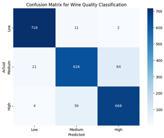 Although some misclassifications are observed, they predominantly occur between adjacent quality levels, which is consistent with the subjective nature and inherent overlap in sensory-based wine evaluations. The strong precision and recall across categories confirm the model’s robustness and its ability to capture relevant patterns in the data, validating the effectiveness of the proposed classification approach.