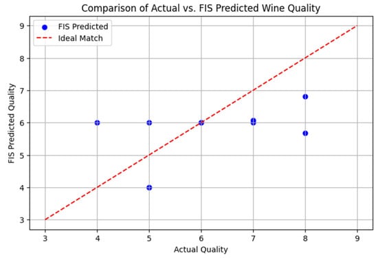 The FIS model was tested on a random sample of 10 white wines, comparing actual quality labels with FIS-predicted scores. The scatter plot (