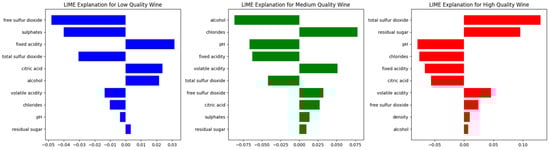 Figure 19, the application of LIME interpretability to three representative wine samples (low, medium, and high quality) reveals the specific physicochemical attributes that most influenced their classification. From an industrial perspective, the integration of LIME-based interpretability allows winemakers and quality control professionals to identify key factors influencing the classification of individual wine samples, providing actionable insights for production optimization. For low-quality wines, adjustments in sulfur dioxide levels and acidity management may help improve quality. For medium-quality wines, optimizing alcohol content and chloride concentration can enhance consistency, while for high-quality wines, monitoring sugar levels and sulfur dioxide balance is relevant for maintaining premium standards.