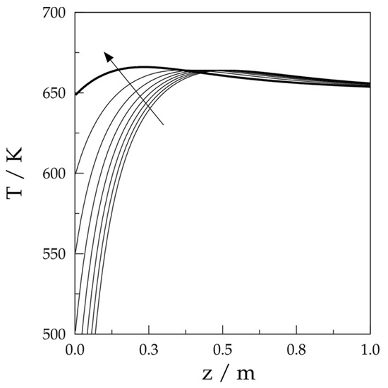 Regarding possible radial variations, earlier work ruled out significant radial influences under the given conditions [16,17]. If higher values for the reactor tube diameter are to be considered, the 1D model probably needs to be replaced by a 2D model using cylindrical coordinates, i.e., including the radial direction [3]. Instructive reports are the works of Donaubauer et al. [18] and Kern and Jess [19].