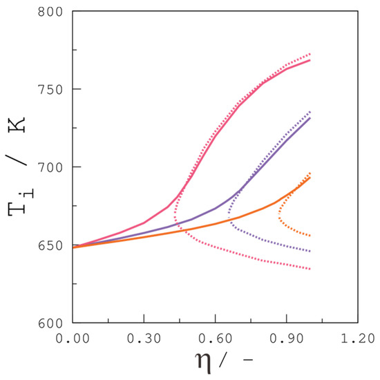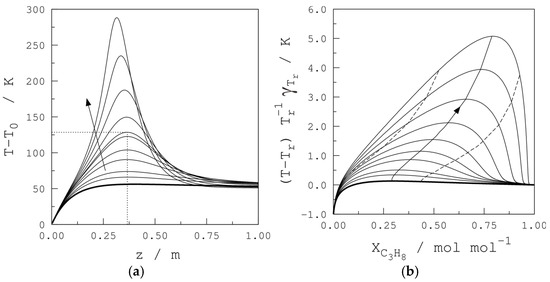 Lastly, it can be noted that the Barkelew criterion can be applied for any exothermic reaction, where the compound properties (reaction enthalpy to calculate the heat produced during reaction and the specific heat capacity) and reactor operational properties (such as inlet molar fraction, reactor diameter, overall heat transfer coefficient, bed porosity, particle porosity, and catalyst density) must be properly substituted in Equations (25) and (26). Furthermore, the calculation of the reaction rate coefficient needs to be performed based on the actual kinetic model and the specific value of the effectiveness factor (along the reactor axis) (see Equation (27)).