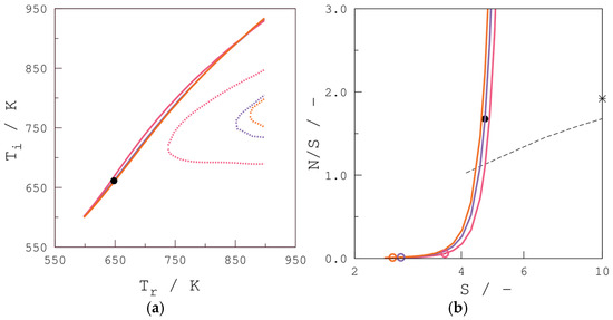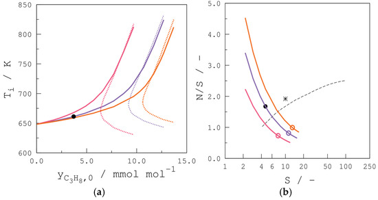 Since the total oxidation reaction rate, , is a monotonically decreasing function of the propane conversion, the highest value for is obtained at the inlet conditions. In addition, at the reactor inlet, the highest effectiveness factor, η, is obtained. Putting all the information together, Equation (26) gives the minimum value for N, and it is this value that is required for interpretation of the Barkelew diagram (see Section 4.3.3).