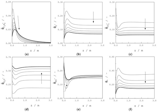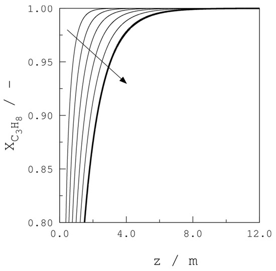 Within the catalyst particle, temperature gradients are generally smaller than concentration gradients [3]. In order to account for the concentration gradients inside the catalyst particle, an effectiveness factor can be calculated. This factor corresponds to the ratio of the rate of reaction with pore diffusion resistance to the reaction rate at surface conditions, i.e., without internal gradients. Hence, the specific production rate in Equations (1) and (2) equals , with being the rate of disappearance of propane (see Section 2.3), and it is possible to characterize the situation inside the catalyst particle by means of a single number, [3]. Nevertheless, it is common to use constant effectiveness factors [20,21,22], where calculated values for are updated along the axial position in the reactor. Instructive examples can be found in Lee et al. [23], investigating the kinetics and effectiveness factor for methanol steam reforming over Cu/ZnO/Al2O3 catalyst; Carrasco-Venegas et al. [24], describing the catalytic dehydrogenation of cyclohexanol; Lee et al. [25], reporting on the simulation of a fixed-bed reactor for dimethyl ether synthesis with complex kinetics; and Kim et al. [26], proposing a novel method for an effectiveness factor estimation of two simultaneous reactions in the preferential CO oxidation over CuO/CeO2.