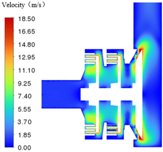Figure 27 displays the cross-sectional velocity distribution for the grinding-type mixing pumps M3 and M6. According to the velocity distribution contour plot, a reduction in the number of teeth on the rotor and stator within the gear structure of the grinding-type mixing pump facilitates an increase in fluid velocity within the pump body. The maximum fluid velocities within pumps M3 and M6 are 18.5 m/s and 19.7 m/s, respectively. Furthermore, the primary high-velocity flow regions for both pumps are within the gear structure, with relatively minor velocity variations observed within the channel and cavity structures.