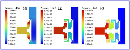Figure 8 shows the pressure distribution profiles of the grinding-type hybrid pumps M1, M2, and M3. According to the pressure distribution contour plots, as the number of stages in the grinding-type hybrid pump increases, the inlet pressure gradually rises, with values of 1.74 × 105 Pa for M1, 5.73 × 105 Pa for M2, and 8.10 × 105 Pa for M3. Moreover, the main pressure drop occurs in the gear structure for all three pumps, M1, M2, and M3, while the pressure changes in the channel structure and cavity structure are not significant.