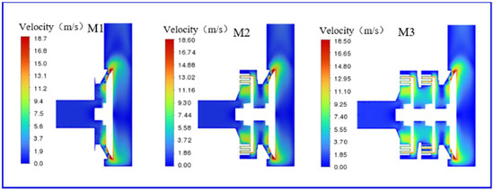 Figure 9 presents the velocity distribution profiles of the grinding-type hybrid pumps M1, M2, and M3. According to the velocity distribution contour plots, the main high-speed flow areas in all three pumps, M1, M2, and M3, are located in the gear structure, while the velocity changes in the channel structure and cavity structure are relatively small. Since the highest velocity is generated by the rotor’s transmission of fluid within the pump body in the gear structure, and the rotor speed and radius are equal in pumps M1, M2, and M3, the variation in the number of stages in the grinding-type hybrid pump has a minor impact on the maximum velocity of the fluid within the pump.