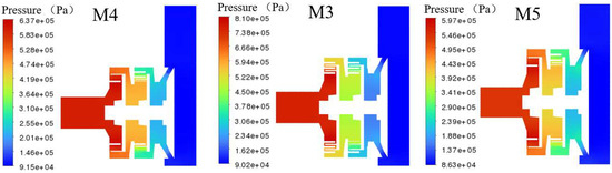 Figure 17 shows the cross-sectional pressure distributions of the grinding mixing pumps M4, M3, and M5. As can be seen from the pressure distribution contours, with the increase in the pump diameter of the grinding mixing pumps, the inlet pressure gradually decreases, reaching 9.94 × 105 Pa for M4, 8.10 × 105 Pa for M3, and 5.97 × 105 Pa for M5. The main pressure drop occurs in the gear structure, while there is no significant change in pressure within the channel structure and chamber structure.
