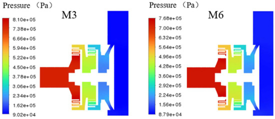Figure 26 shows the cross-sectional pressure distribution for the grinding-type mixing pumps M3 and M6. According to the pressure distribution contour plot, as the number of teeth in the gear structure of the grinding-type mixing pump decreases, the surface area of both the rotor and stator diminishes, leading to a reduction in the flow resistance experienced by the fluid. Consequently, the inlet pressure of pump M6 is lower compared to pump M3, measuring at 7.68 × 105 (for M6). However, the primary pressure drop region for both pumps is within the gear structure, and there is insignificant pressure variation in the channel and cavity structures.