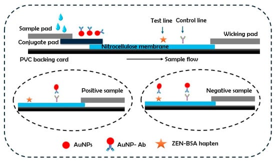 The LFIA strips were assembled using a conjugate pad, nitrocellulose membrane, absorbent pad and sample pad. All pre-treatment and fabrication steps were performed in a clean air flow chamber. The sample and conjugate pad underwent pre-treatment prior to assembly. This pre-treatment is essential for membrane equilibration, preventing the fouling of membrane pores and ensuring the uniform and efficient flow of the sample and conjugate across the membrane [45]. The conjugate pad was immersed in 50 mM PBS buffer solution containing 0.1% BSA, 5% sucrose and 0.05% tween 20 and dried at 60 °C for 1 h. The sample pad and absorbent pad were immersed in 50 mM PBS containing 0.1% BSA, 5% sucrose, 0.01 g sodium azide and 0.05% tween 20 [46]. For the optimization of the performance of AuNP–mAb conjugates, on the nitrocellulose membrane, a test zone was created using ZEN–BSA hapten (Supplementary Figure S1), added at different concentrations from 0.2 mg/mL to 0.8 mg/mL. Then, 10 µL each of AuNP–mAb solution was dropped on the treated conjugate pad and it was dried at 37 °C for 2 h. The assembled strips were then placed in a plastic airtight bag and stored at room temperature for further studies.
