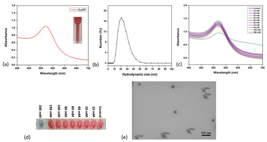 AuNPs of size 20–25 nm were synthesized using the protocol described by Liu et al. [48]. The UV–visible absorption spectrum was recorded in the range of 400 nm to 700 nm, which confirmed the absorbance peak at 530 nm for the formation of AuNPs, as shown in Figure 2a. The hydrodynamic diameter measured using DLS revealed a size of 22 ± 3 nm, as shown in Figure 2b, with a zeta potential of −31.7 mV, indicating good colloidal stability [48]. The critical NaCl concentration to induce the aggregation of the AuNPs in solution was investigated by varying the concentration of NaCl from 10 to 200 mM (Figure 2c). After successfully keeping the gold nanoparticles in the NaCl solution for 15 min, their changes in color and size were evaluated. At low concentrations, i.e., from 20 to 100 mM of NaCl, there was no change in the color of the AuNP solution. A slight color change was observed (Figure 2d) at 150 mM, but, at 200 mM, the solution exhibited a distinctly grey color, indicative of AuNP aggregation. Although the original peak at ~530 nm is still evident in the spectrum in Figure 2c, a broad redshifted absorption band is evident, in the region of 600–700 nm, which was responsible for the observed color change.