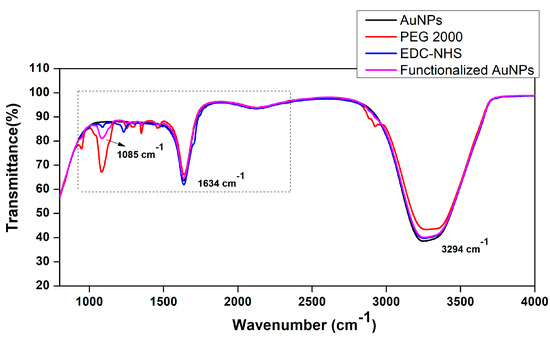 FT-IR spectra of the functionalized AuNPs with polyethylene glycol and EDC-NHS, recorded in the range of 400–4000 cm−1.