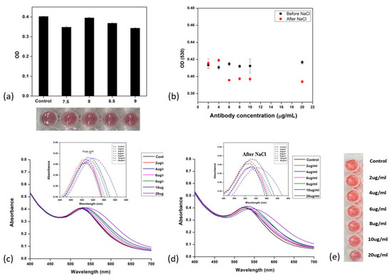 Direct adsorption of anti-zearalenone antibody on AuNPs. (a) Determination of optimum pH for antibody attachment (OD) (530)—antibody concentration was kept at 4 µg/mL; (b) change in OD (530) with different concentrations of anti-zearalenone, i.e., from 2 to 20 µg/mL, before and after adding NaCl (200 Mm); (c) UV–visible spectroscopy for different concentrations of anti-zearalenone (without NaCl); (d) UV–visible spectroscopy for different concentrations of anti-zearalenone (with NaCl); (e) AuNPs with different concentrations of anti-zearalenone antibody, 2–20 µg/mL.