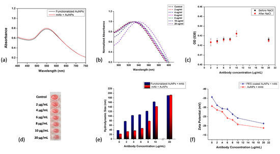 A slight change in the color of the AuNP–mAb solution was observed as the concentration of antibodies in the solution was increased from 2 μg/mL to 10 μg/mL, and, at 20 μg/mL, the mixture turned dark pink (Figure 4e) due to strong electrostatic interactions between the antibodies and the AuNPs [46]. The absorbance value increased when antibodies were added at the concentrations of 2 and 4 μg/mL, which was observed as an increase in the peak height. The physical adsorption of antibodies on the AuNP surface is a result of electrostatic and hydrophobic interactions. However, some of the interaction can be disturbed by mechanical agitation, such as ultrasonication, which can lead to the loss of biomolecular activity [52]. The excessive introduction of antibodies in the colloidal reaction mixture can lead to an increase in the thickness of the biochemical coating on the particle surface. It can be elucidated that the layer of Ab attached closest to the surface of the AuNPs is strongly attached, becoming part of the hard protein corona on the AuNP surface. The outer soft coronae on the surfaces of the AuNPs are based on protein-to-protein interactions and can be easily removed or dismantled during nanoparticle washing or buffer exchange steps [53,54].