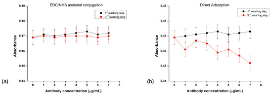 The stability of the prepared AuNP–mAb conjugates from both methods was investigated by observing the change in the absorbance of the conjugates after a sequence of washing steps. The antibody concentration used was 1–7 μg/mL, and the particles were washed and resuspended in the buffer solution. The change in absorbance was taken after the first and third washes, as depicted in Figure 6. In the case of physical adsorption, the absorbance was reduced after the vigorous washing steps, which could have been the result of the removal of antibodies from the particle surface, leading to the aggregation of the AuNPs. In contrast, a very minute change was observed in the case of chemical conjugation, indicating higher stability and more robust bonding between the AuNPs and antibodies.
