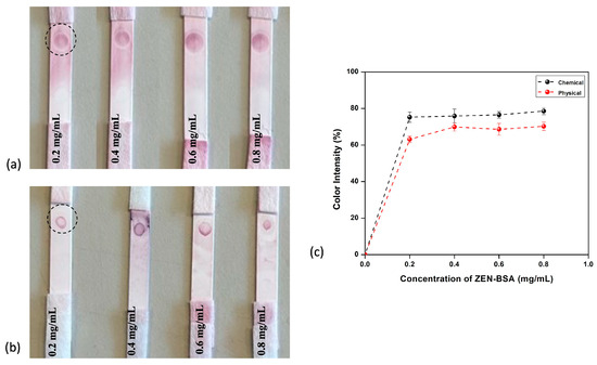 Once synthesized, the bioconjugates were evaluated using fabricated lateral flow assay strips by confirming their association with a test zone containing ZEN–BSA hapten and an assessment of the resultant color intensity. The UV–visible spectroscopy analysis of ZEN–BSA hapten is shown in Supplementary Figure S3. ZEN–BSA was dispensed as a dot at different concentrations from 0.2 to 0.8 mg/mL on multiple strips to check the binding of the conjugates. Both conjugates were dropped on the conjugate pad, and the assay was performed with a buffer solution with no toxin present to check the affinity with ZEN–BSA, as shown in Figure 7a,b. The developed color intensity was analyzed by ImageJ and was plotted with different concentrations of hapten, as shown in Figure 7c. On examining the color intensity, chemically immobilized antibodies were seen to yield better results than physically immobilized ones, as the color intensity was higher in each case, as shown in Figure 7. The intensity of the color was calculated using its RGB values analyzed through ImageJ [64,65]. The formula for the calculation of the pixel intensity was