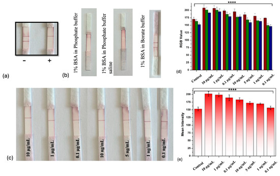 For the optimum results, different buffer solutions were optimized to block the nitrocellulose membrane after the deposition of the control and test lines. Blocking was carried out using phosphate buffer, phosphate-buffered saline and borate buffer with BSA to block the remaining surface. Optimal sample flow with the conjugate and the clear development of the test line and control lines (Figure 8a), free from background staining, were achieved by blocking BSA in 0.01 M borate buffer, which was further used to block the membrane, as shown in Figure 8b. Borate buffer was selected because it maintained the colloidal stability of the gold nanoparticle–antibody conjugates and minimized non-specific binding, which in turn reduces background noise, enhancing the clarity and accuracy of the results. On the other hand, the use of phosphate buffer is linked to increased aggregation, leading to higher background signals, reduced assay sensitivity, the fading of test lines and increased non-specific binding [66,67]. The developed strips were checked for the limit of detection (LOD) using the spiked samples over the range of 10 µg/mL to 0.1 ng/mL. There was no test line observed down to a concentration of 1 ng/mL, but, as the concentration was reduced to 0.1 ng/mL, there was a slight color developed, which could be seen by the naked eye, as shown in Figure 8c. The visual LOD was determined by the minimum concentration of toxin used that led to color development on the test line as visualized by the naked eye. The captured images of the LFIA strips were uploaded to the ImageJ software to analyze the white color mean intensity of the test line plotted against the zearalenone concentration, which showed a decrease in color intensity in the control sample as compared to the positive samples shown in in Figure 8d with decreasing concentrations.
