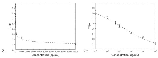 where x(0) is the unexposed value of T/T0; x(sat) is the high-concentration, saturated value; n is the Hill slope; and K is the equivalent of the Langmuir constant. In the fit in Figure 9a, plotted semi-logarithmically in Figure 9b for the better visualization of the lower-concentration region, n = 0.29 and K = 20.1 ng/mL. Based on the methodology described in Section 2.4, the LOD was calculated to be 0.71 ng/mL, while the visual LOD was 1 ng/mL. The LOQ was calculated to be 2.37 ng/mL. The LOD achieved for the detection of zearalenone as compared to other developed strips is much lower [69,70], and it can provide both qualitative and quantitative results.